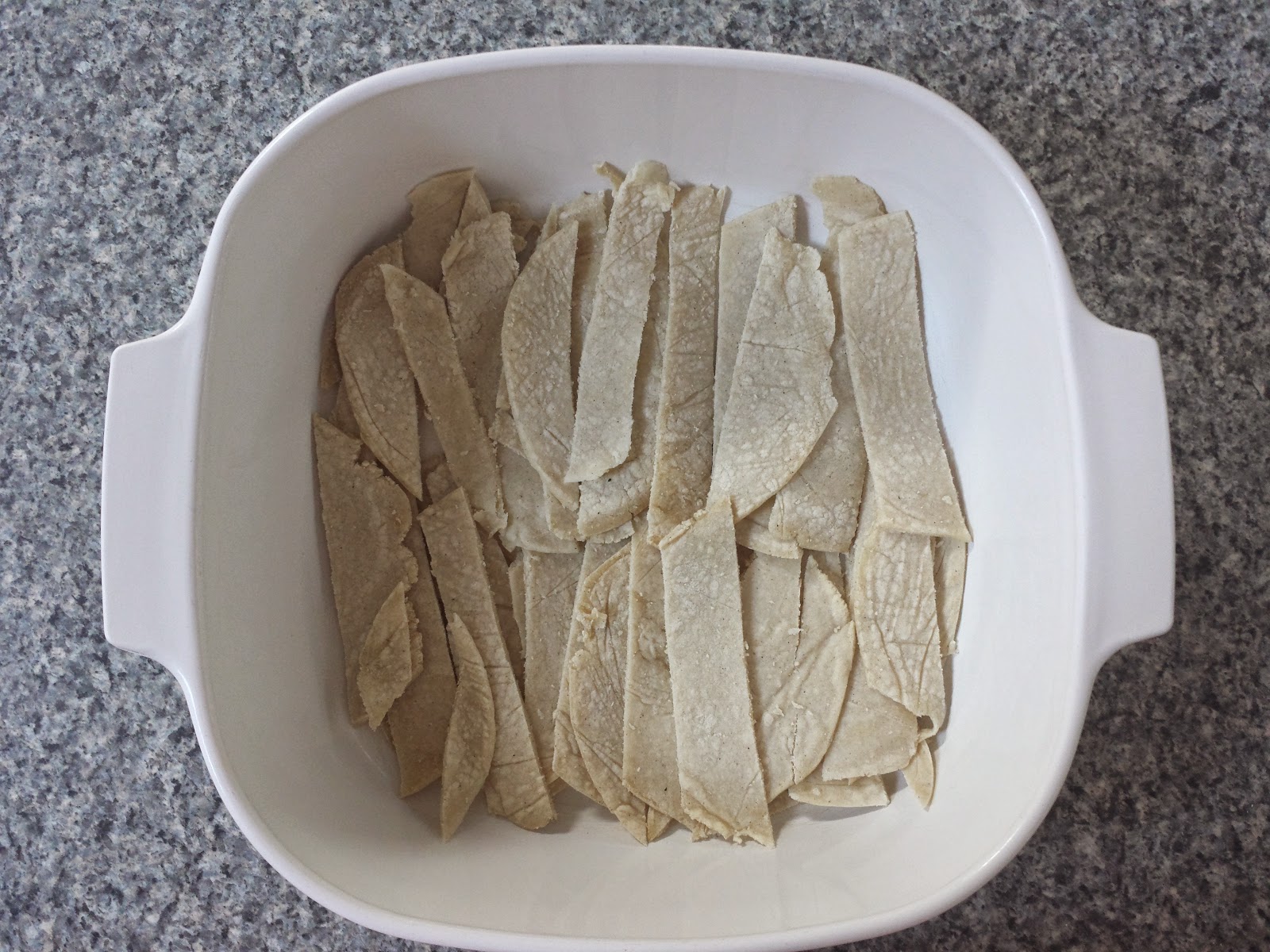 - Place half of the tortillas strips in a row in a 8×8 baking dish.