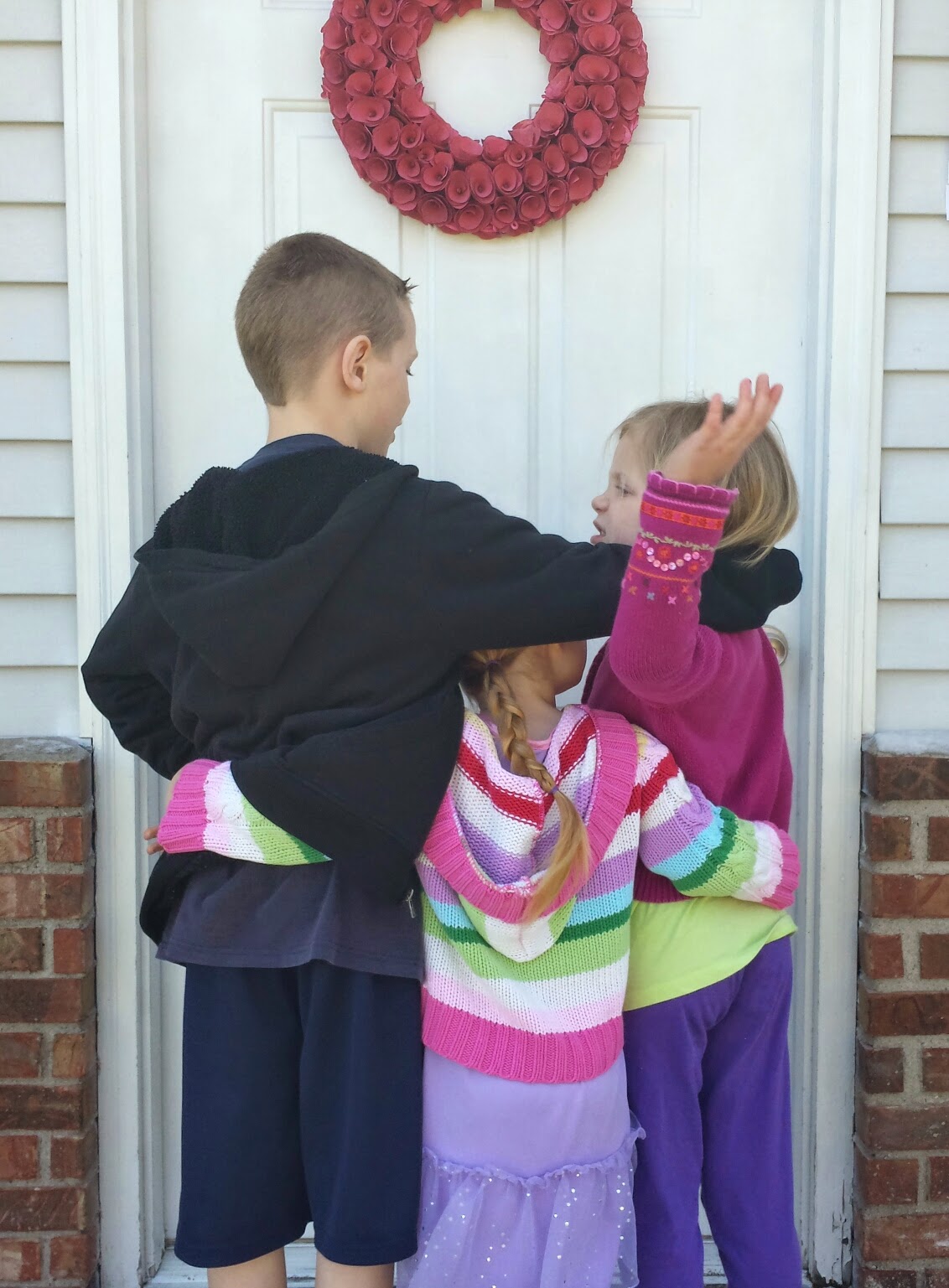 Proof that we are constantly working at this. I had to take this picture several times to be able to capture the right moment. In this real life moment a sister giving her brother a little hit to say you are squeezing me to hard. 🙂