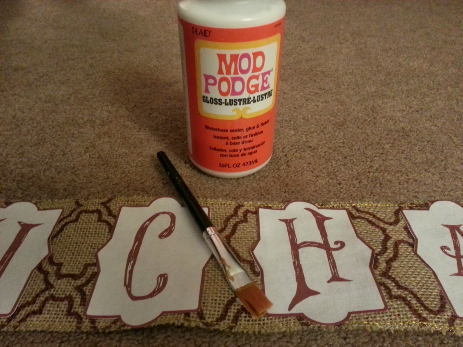 With your paintbrush apply a generous amount of Mod Podge to the back of each letter and place on burlap. Press each letter down firmly to the burlap. Allow to dry overnight. Apply more Mod Podge to any of the corners that may not have completely adhered to the burlap.